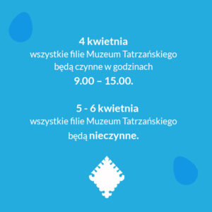 5 – 6 kwietnia (Niedziela i Poniedziałek Wielkanocny) wszystkie filie i oddział Muzeum Tatrzańskiego będą nieczynne.